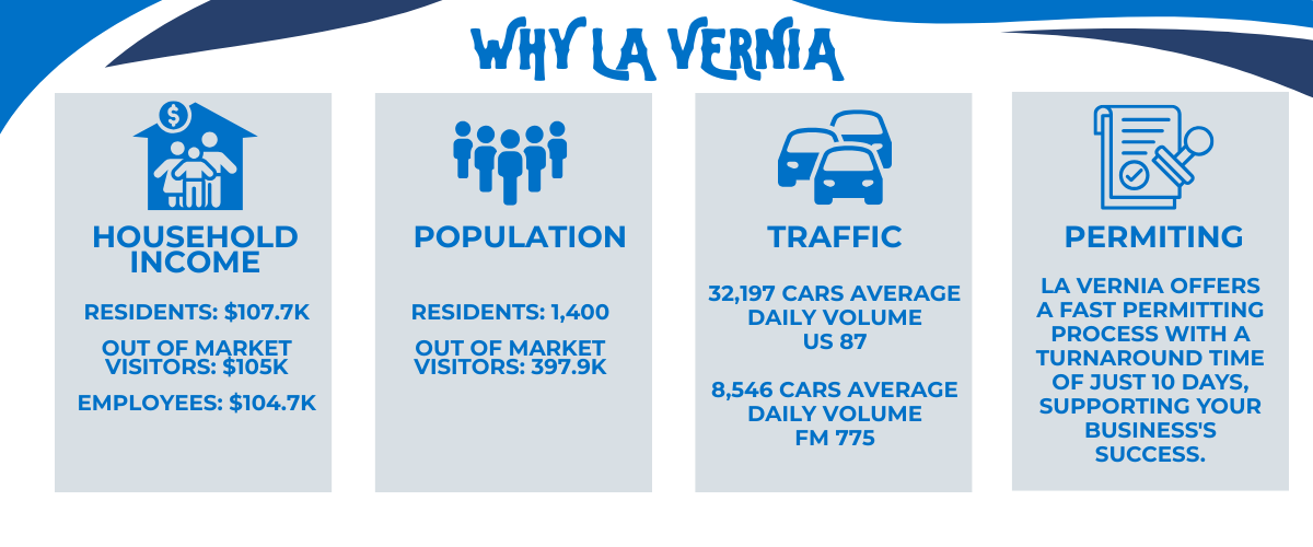 Strong community roots, rising household incomes, and booming traffic make La Vernia the smart choice for your next retail investment.